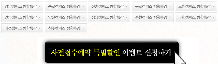 [이벤트]여름방학특강 사전접수 할인 이벤트 2013.05.29 여름방학특강 사전접수이벤트 이벤트 기간내에 사전접수 하시면 7만원 할인쿠폰(최대50%할인)를 SMS문자로 받으 실 수 있습니다.